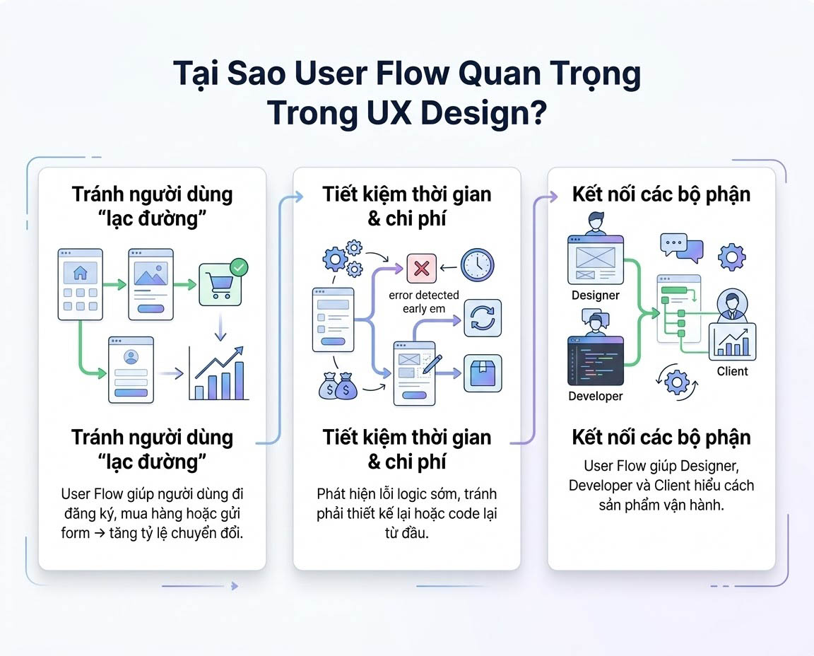 Rất nhiều người thường bỏ qua bước này và nhảy thẳng vào vẽ giao diện. Dưới đây là lý do tại sao User Flow quan trọng: